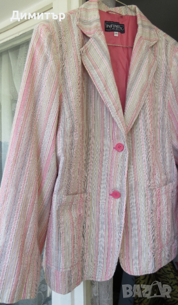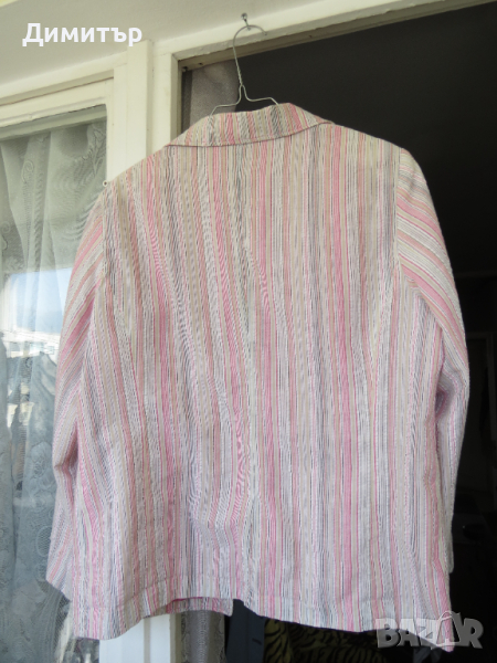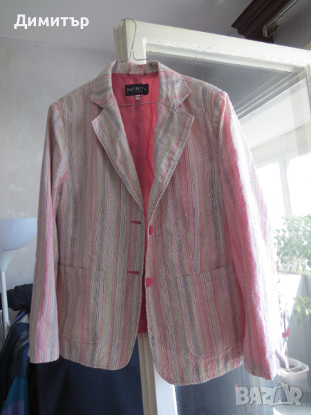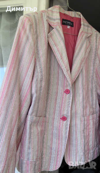 Продавам дамско леко сако, 65 % памук, Сакото е с розовата подплата, с джобове, с размери дължина 67 см, гръдна обиколка 116 см, ширина на гърба горе- 43 см, дължина на ръкава- 59 см.