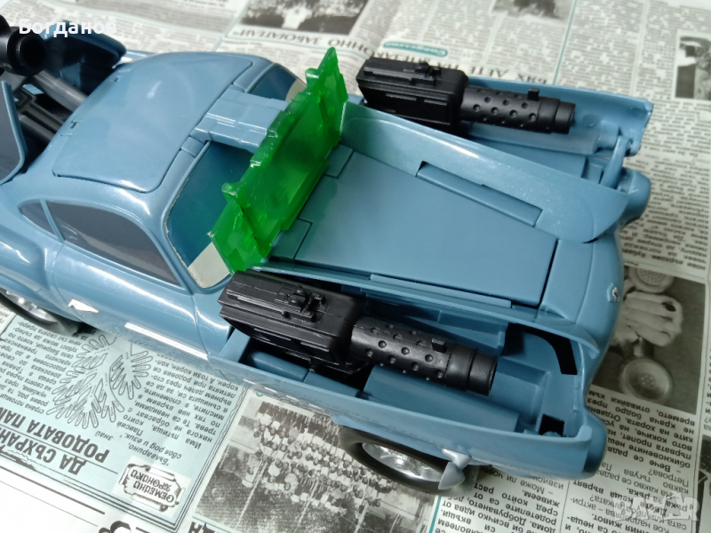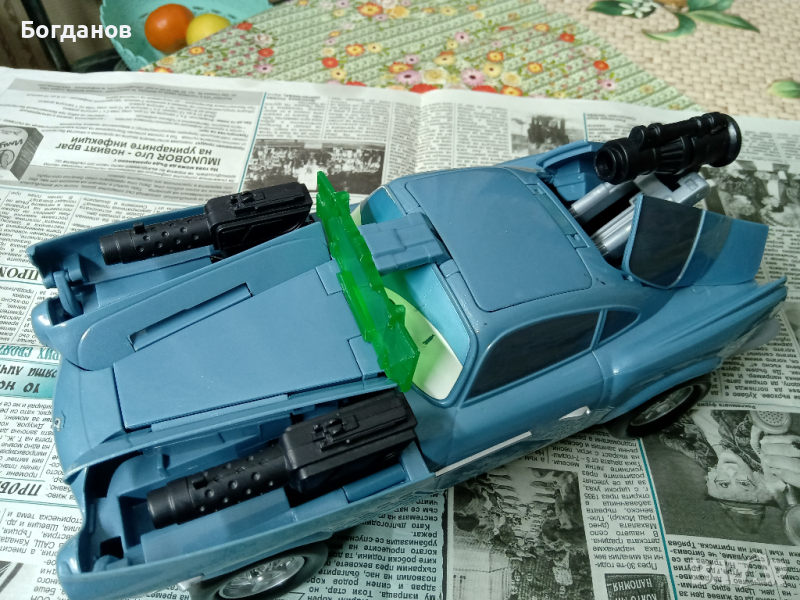Колата е запазена,Капака на Двигатела се натиска и се отварят калниците,излизат оръдия.Капака като се натисне по средата издава звуци,стрелба и др.Люка се отваряи вътре по-средата се откопчава и излиза зелено пред предното стъкло.Отзад откъм багажника се отваря една от вратите и се надига синьото лостче и излиза оръдието.Колата е запазена,ефектна е.За звука с три батерии А76 1.5 в. 100 % реални снимки
