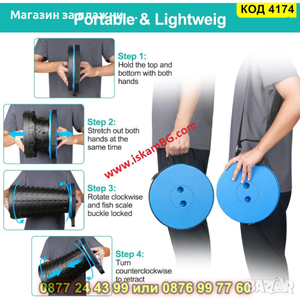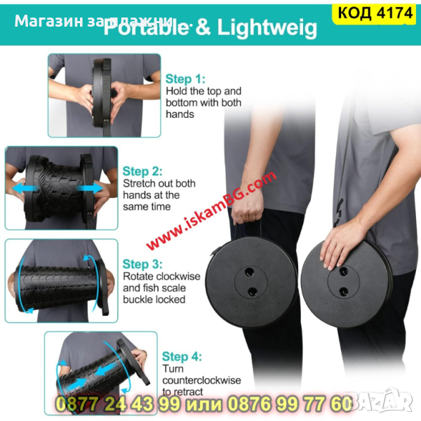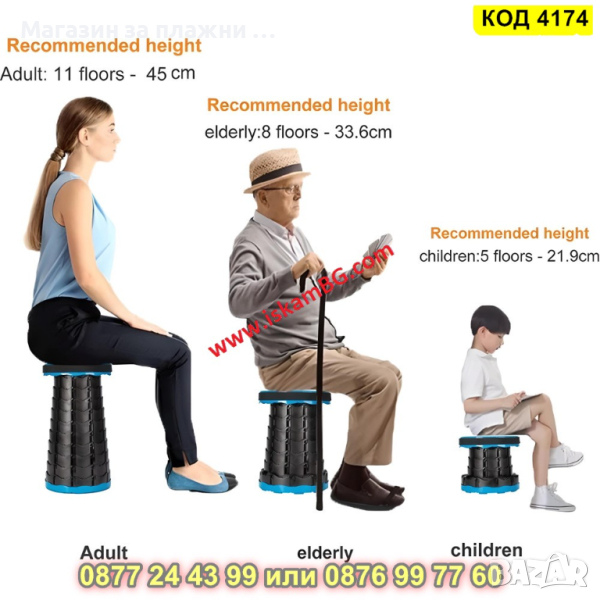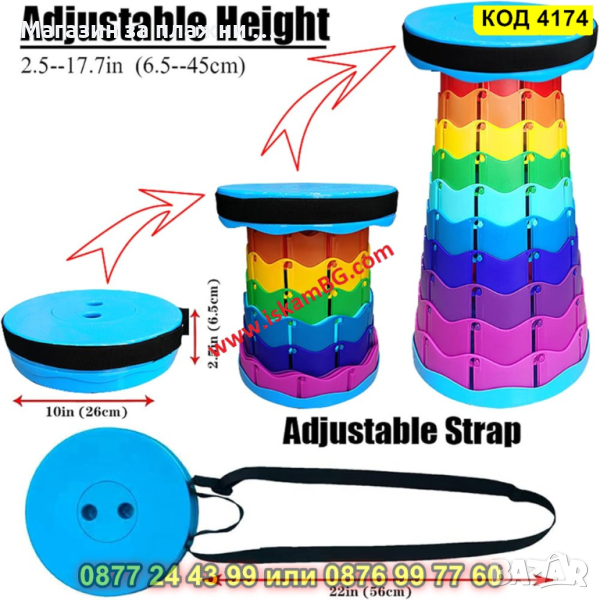 Напълно разгънатата табуретка е с височина 45см! Структурата на табуретката ви позволява да я поставите в 9 позиции !Само я заключете на избраното място при разгъване! Сгънатата табуретка ще работи чудесно и като столче за риболов, излет, къмпинг или просто като преносимо столче за възрастни хора! За разгъване на табуретката : Хванете дръжките на седалката и в същото време дъното на табуретката. Внимателно завъртете дръжките наляво и изпънете табуретката на подходящата височина. Уверете се, че заключващите зъби са заседнали в ключалките в правилната позиция. Насладете се на удобна седалка!