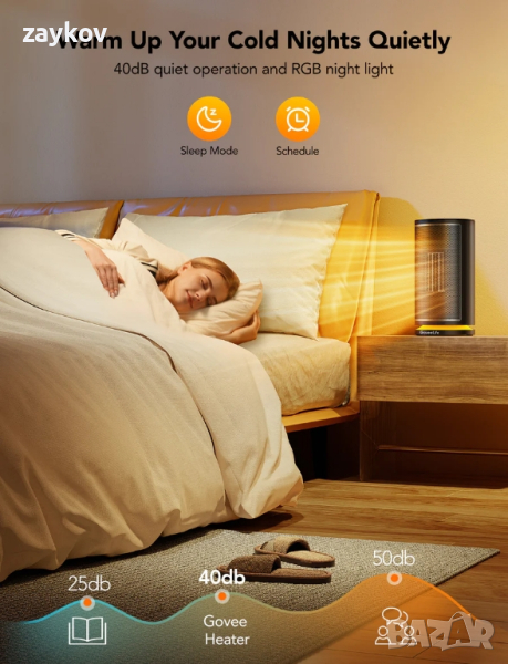 Нисък шум и RGB нощна светлина: Нагревателят работи под 40 dB. Променете различни RGB светлинни цветове чрез Govee Home.