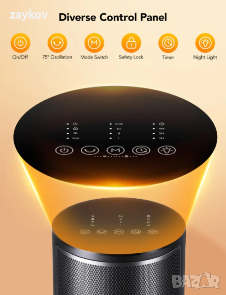 4 режима на отопление и режим на вентилатор, автоматична постоянна температура, нисък шум и RGB нощна светлина
