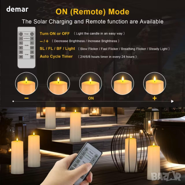 Комплект от 2 водоустойчиви слънчеви свещи IP64, идеални за използване на открито във вашата градина, вътрешен двор или приключения на къмпинг. Тези изключително големи свещи (D 10,2 cm * H 25,4 cm) излъчват топла бяла светлина, създавайки романтична атмосфера за вашите вечери. Със слънчево презареждане, просто превключете на "слънчев" режим за автоматично зареждане под пряка слънчева светлина, осигурявайки 16-26 часа осветление при ниво 3 на яркост. Като алтернатива изберете възможност за презареждане през USB за постоянна употреба, предлагаща 80-250 часа светлина при различни настройки на яркост. Снабдени със сензор за светлина, тези свещи автоматично светят на тъмно и се изключват при ярки условия в соларен режим. За допълнително удобство използвайте функцията за дистанционно управление в обхват от 6 метра, за да управлявате функции за ВКЛЮЧВАНЕ/ИЗКЛЮЧВАНЕ, нива на яркост, светлинни режими и таймери. Моля, обърнете внимание, че светлинният сензор е неактивен в дистанционен режим, което гарантира гъвкава употреба според вашите предпочитания.