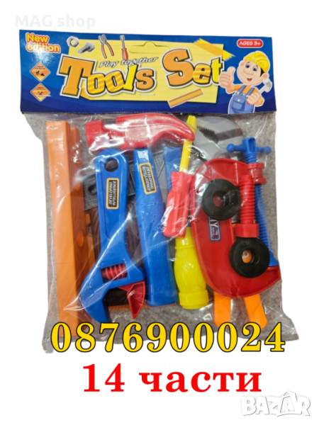 Детски комплект включващ 14 различни аксесоара и инструменти като чук, отвертка, гаечен ключ и други.