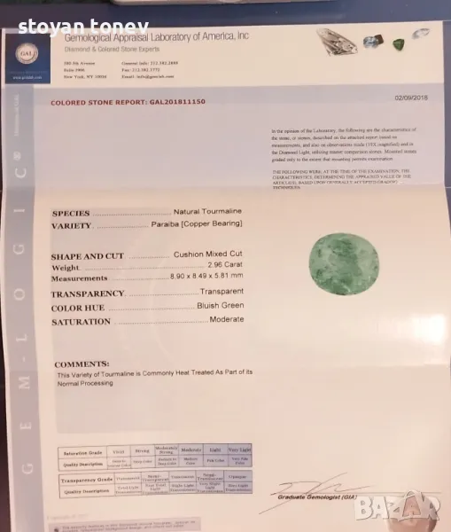 Стандартно нагряван. Сертифициран от GAL - Gemological Appraisal Laboratory of America,Inc.
