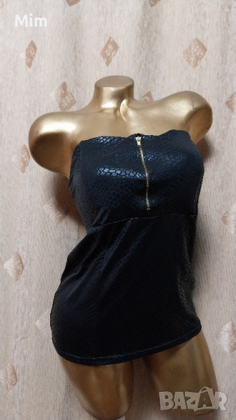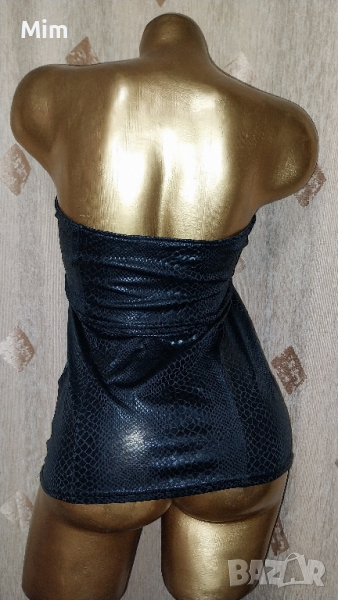 Черен еластичен корсет/топ/ змийски принт с подплънка която може да се маха или сменя с друга .Подмишници 42 до 52 см едностранно, ханш 45 до 55 см едностранно ,дължина 44 см. Няма забележки.