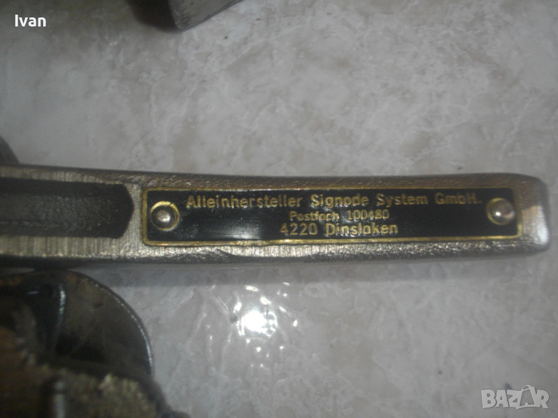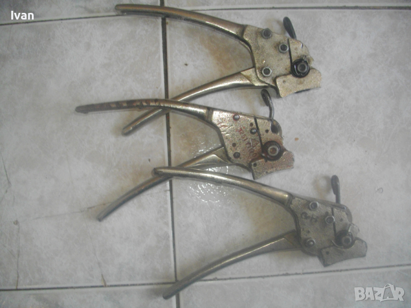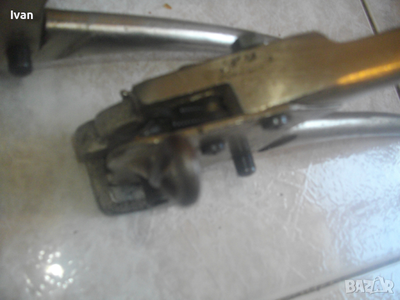 ОПИСАНИЕ на ръчен метален чембер обтегач /клещи/ за неметални РР ленти - цена 1 бр - 199 лв.(101.75 €). Немски професионални, запазен външен вид и отлично работно техническо състояние. Маркировки - Alleinhersteller Signode Sistem GmbH - Dinsloken. Дължина на чембера обгетач ръчен 220 мм. Масивен изцяло, от плътна стомана. С пружиина на дръжките и тресчотъчен механизъм. Този тип ръчен чеембер обегач работят с чембер лента пластмасова РР и обтегачи чембер скоба тип СВ. Инструментът е обтягаща чембер машина за ръчни чембер машинки, за обвиване и пристягане с пластмасова чембер лента на различни товари с кръгла или неправилна форма, кашони, стоки върху палети, дървен материал, паркети, кутии, сандъци, различни по форма пакети, бетонови блокчета, плочки, бордюри, бали, тръби,дъски, варели, палети с тухли и др. Машинките са подходящи за работа при всякакви работни повърхности(плоска, хоризонтална, вертикална). Могат да работят с всички видове пластмасови чембер ленти с ширини от 9мм до 19мм. Работят с метални или с пластмасови скоби. Осигуряват безопасно,сигурно закрепване и стягане на товари и предмети с пластмасова лента. Тегло на инструмента - 1,0 кг.