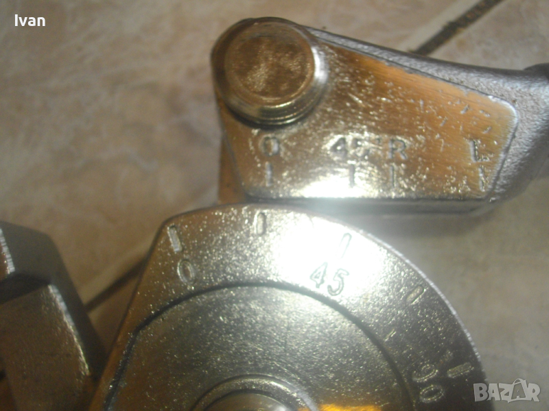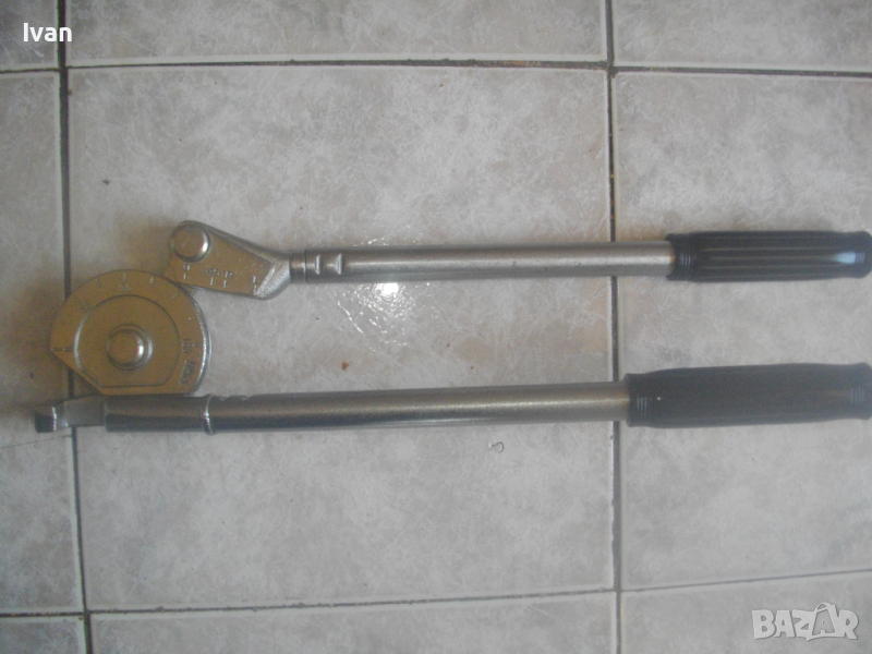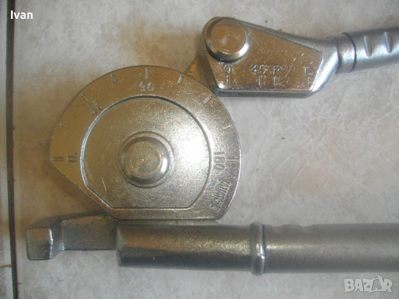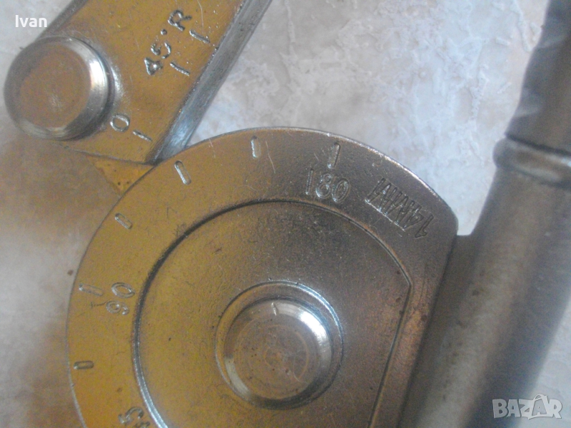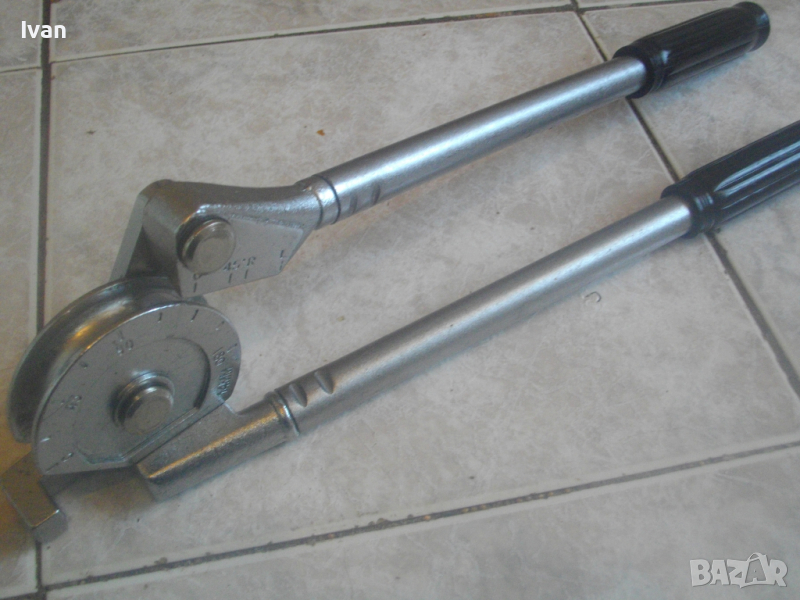 ОПИСАНИЕ на ръчен тръбогиб 14 мм - цена 199 лв. Ръчен уред за огъване на меки и полутвърди тръби диаметър ф 14 мм. Инструментът е немски професионален, с прецизно разграфена глава за огъване 0-180 градуса. Съвсев нов, неизползван и неупотребяван. В отличчно работно, техническо и визуално състояние. Вграден с корпуса еднокомпонентен водач. Стегнато огъване, без луфтове. Радиус на огъване R 45 mm. Тръбогибът е изцяло метален, чмасивен, с кухи тръби ф 25 мм за дръжки с дълги, масивни, нехлъзгащи се гумени покрития на дръжките. Дължина на инструмента - 430 мм, тегло - 1,2 кг.