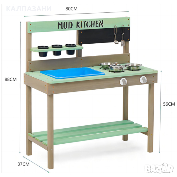 БЕЗОПАСНА ЗА ДЕЦА: Детската лятна кухня е изработена от 100% борово дърво с покритие без мирис на водна основа, тествана за безопасност, здравина и стабилност, отговаря на всички европейски стандарти.