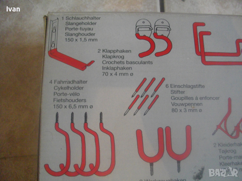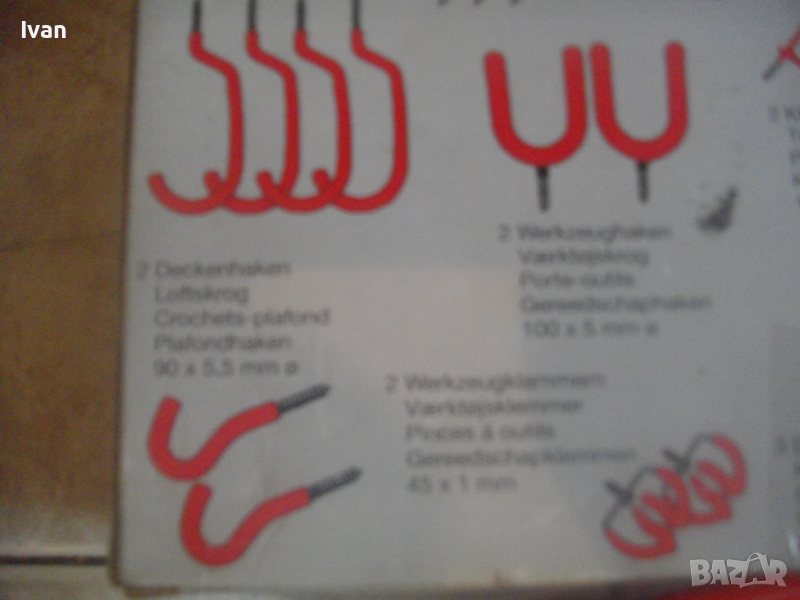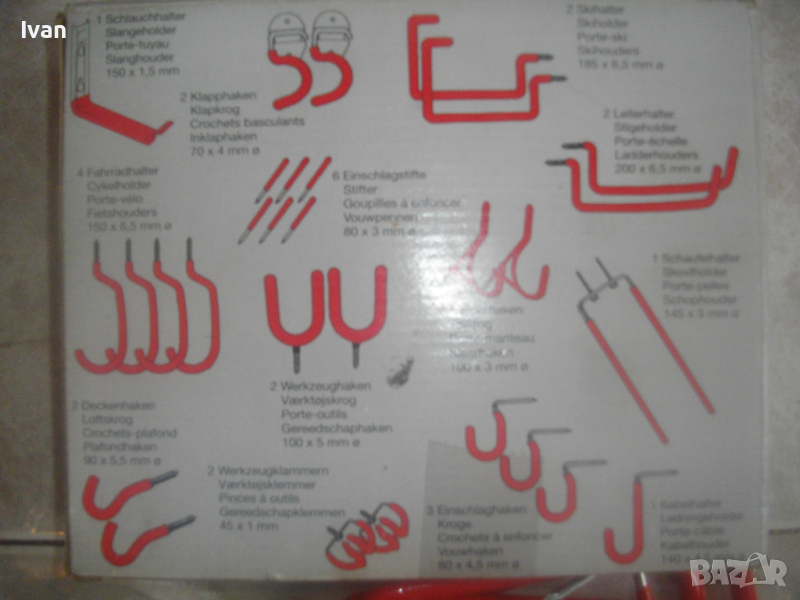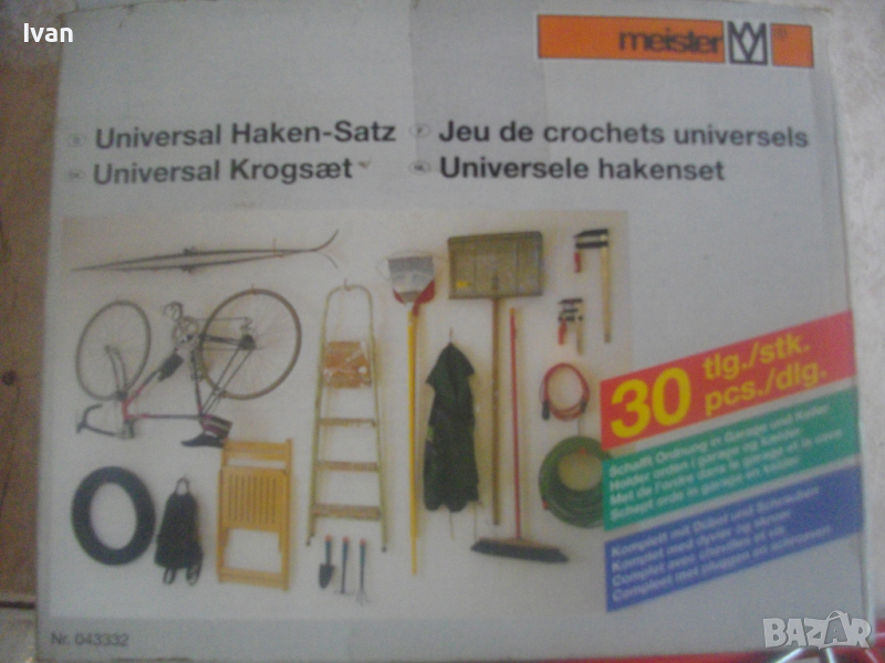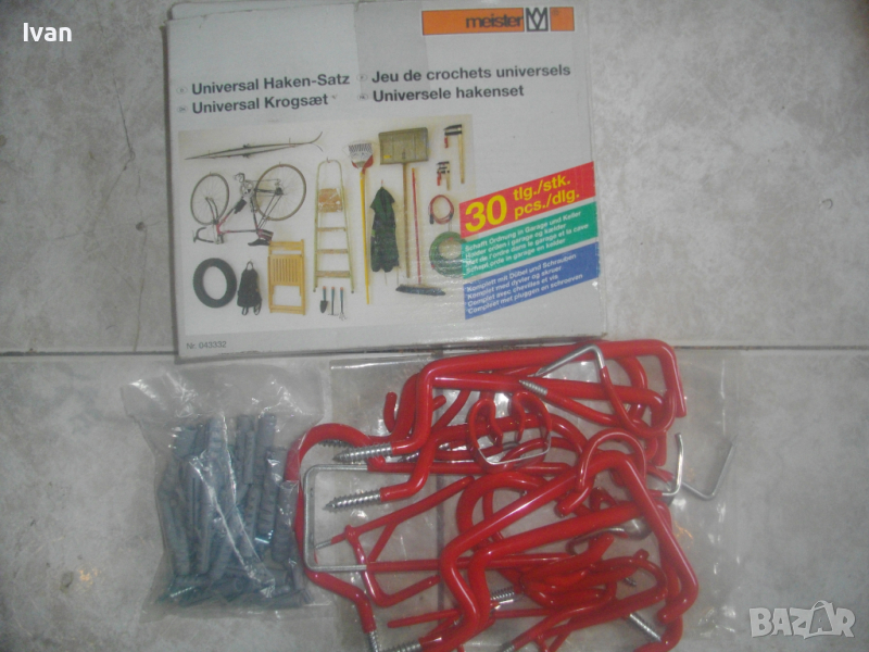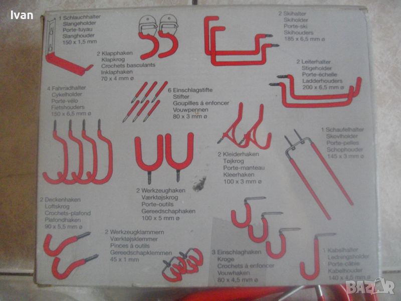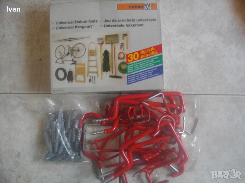 ОПИСАНИЕ на нов комплект немски оригинален куки за окачване на тежки натоварвания в картонена немска опаковка- цена 79 лв. Професионален комплект куки с ПВЦ вложки покрития на куките за предпазване на окачените повърхности, модел на профи концерна за професионални инструменти Meister. Съвсем нов немско оригиналенкомплект куки 29 части за окачване с тежки натоварвания.