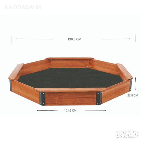 ПРОСТОРЕН ДИЗАЙН: С размери 199 (Д) X 199 (Ш) x 23 (В) см. и капацитет на натоварване от 350-450 кг. пясък, дървеният пясъчник е идеален за настаняване на 6-8 деца едновременно с 4 вградени седалки.