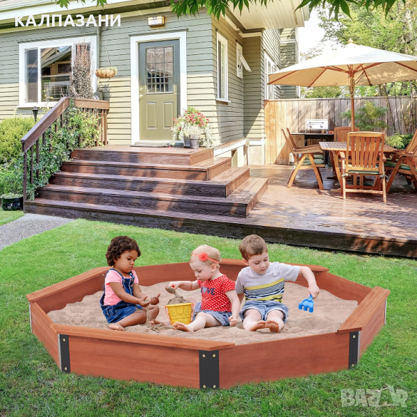 СЪЗДАДЕН ДА ИЗДЪРЖИ: Детския пясъчник GINGER HOME с форма на осмоъгълник е проектиран за издръжливост, стабилност и безопасност, със здрави дървени панели, свързани с метални стълбове, за да издържат на атмосферни условия на открито и груба игра.