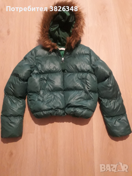 Яке дамско бомбър-късо,цвят маслено зелен,качулка с пух.