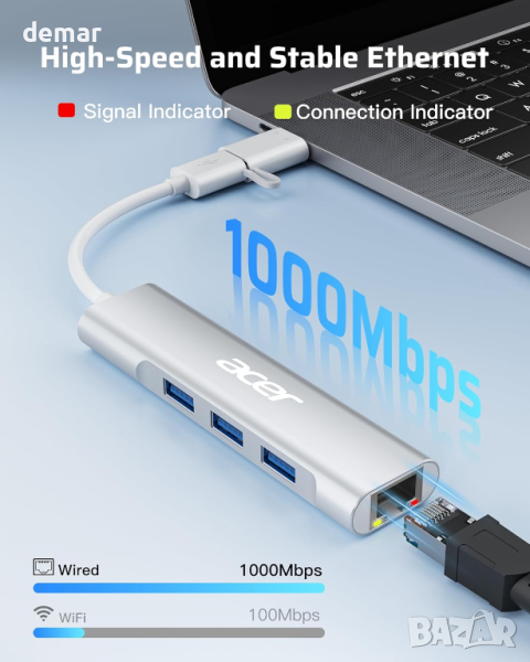 Acer USB А към Ethernet адаптер, 4-в-1 USB-А хъб с 3 USB-A 3.1 и 1Gbps RJ45 - НЯМА А към С адаптер