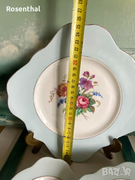 Състои се от 6 десертни чинийки и 1 по-голяма. Размерите са показани на последните 2 снимки.