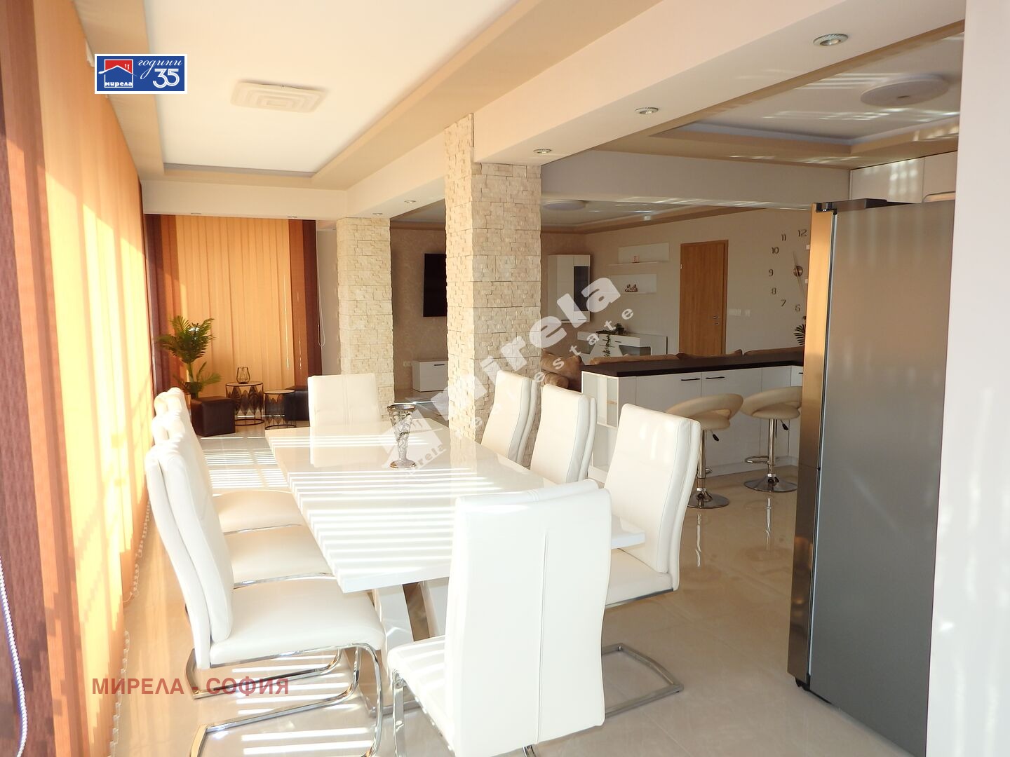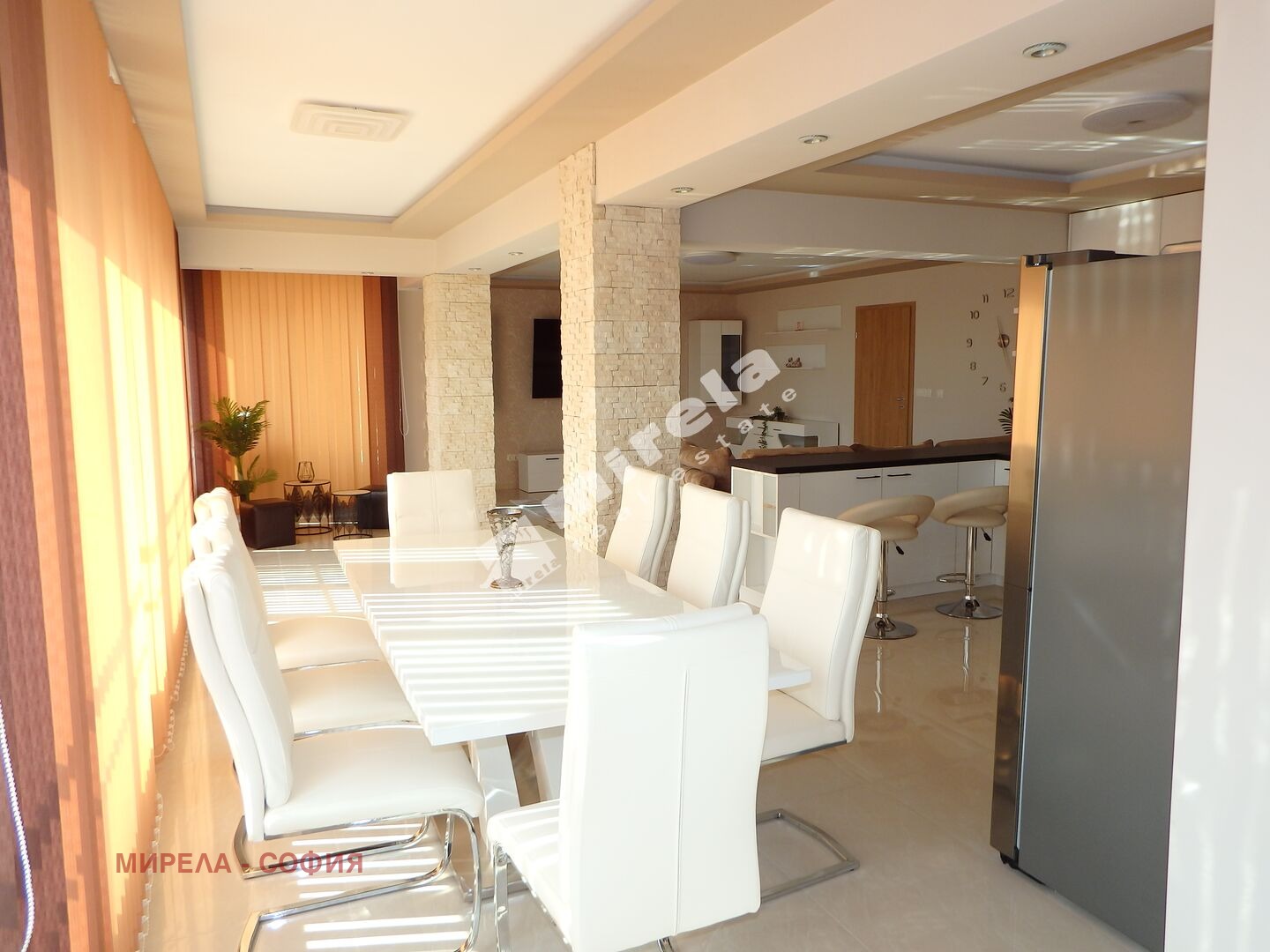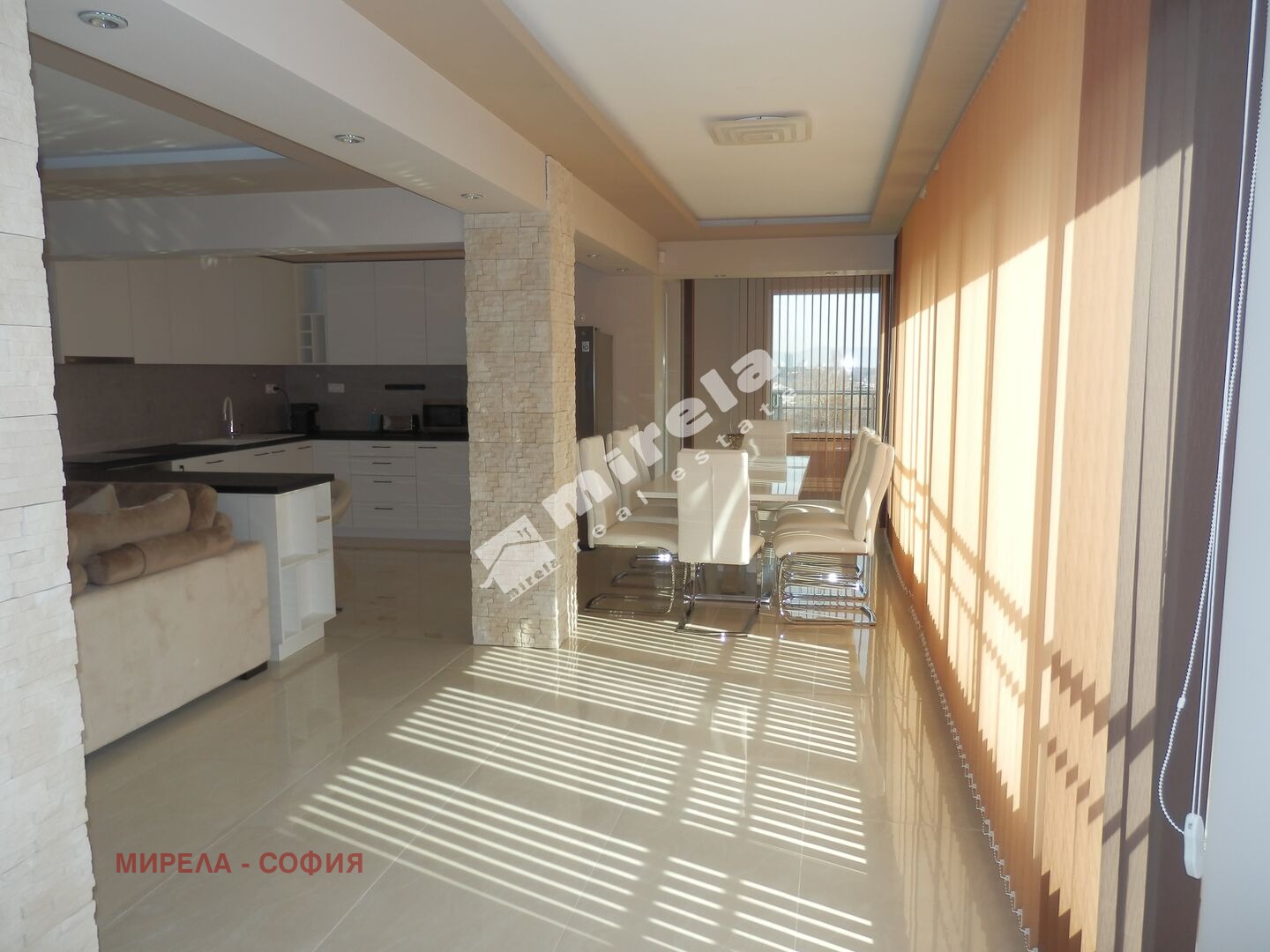 Апартаментът е със застроена площ 202 кв. м и 37 кв. м общи части. Разположен е на етаж четвърти от пет етажна сграда. Състои се от антре, общо дневно пространство с кухненски бокс и трапезария с площ от около 80 кв. м, две спални, като родителската е доста просторна с голям дрешник и собствена баня и тоалетна, втора баня с тоалетна и склад. Разполага със зимна градина и открита тераса с панорамна гледка към София с достъп от всички помещения.