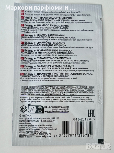 Vichy Dercos - Energy+ Стимулиращ шампоан за растеж и против косопад, мостра 6 мл!