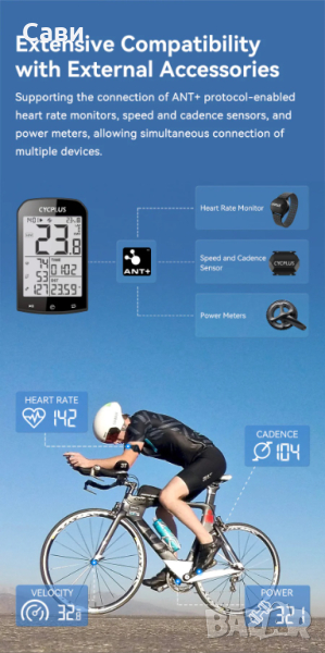 - ANT+ Поддържана периферия: монитор за сърдечен ритъм, сензор за ритъм, мощност - Данни в реално време, показващи: максимална/текуща/средна скорост, каданс, сърдечен ритъм, мощност, градиент; Време, разстояние, изкачване, ODO, надморска височина, температура