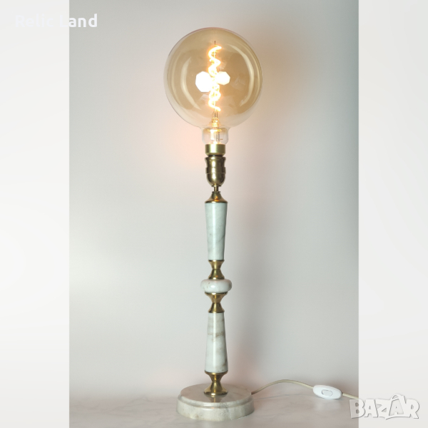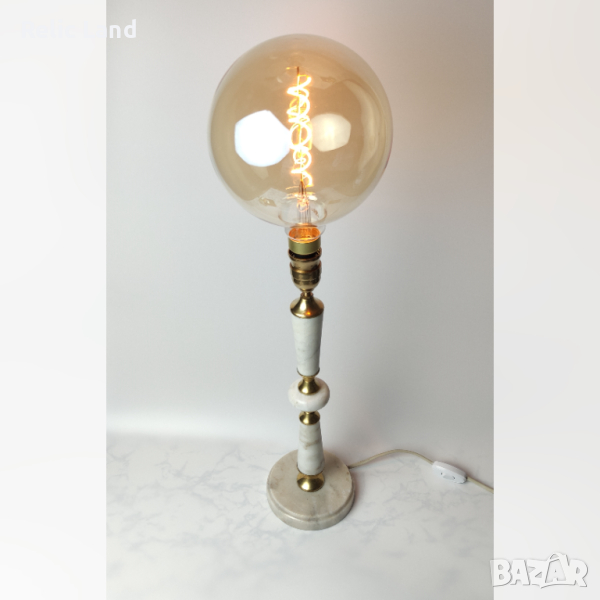 Ретро настолна лампа с основа от мрамор и месинг. Подходяща за декорация или като нощна лампа. Крушката е голям балон с диаметър 20см - Philips Led Vintage 4.5W равняващи се на 28W обикновена крушка. Светлинен поток 300 лумена, 1800К ( топла светлина ) и живот 15 000 часа. Крушката е нова и не се ползва!