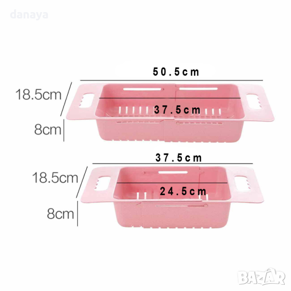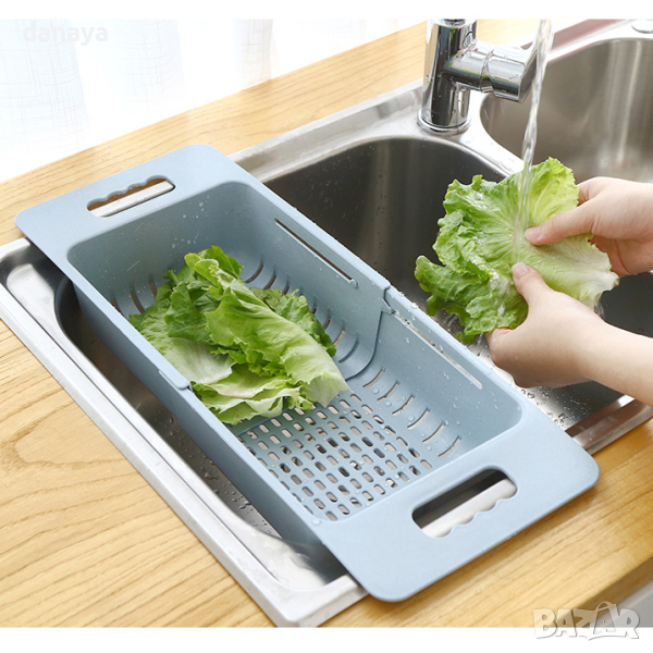 Пластмасов, разгегателен гевгир за кухненска мивка. Мултифункционален сушилник, който се поставя върху кухненската мивка. С негова помощ лесно и удобно ще измиете плодове, зеленчуци, паста и други хранителни продукти. Може да се използва и за сушилник за съдове и прибори. С дръжки от двете страни. Предлагат се в различни цветове – син, зелен, розов, светло бежев, сив.