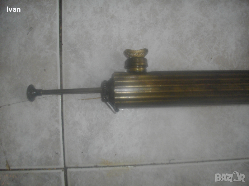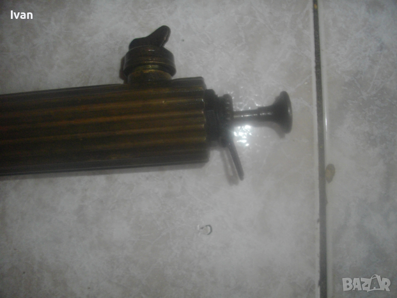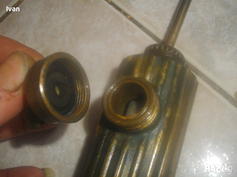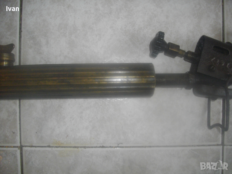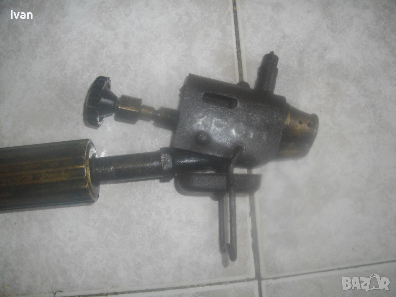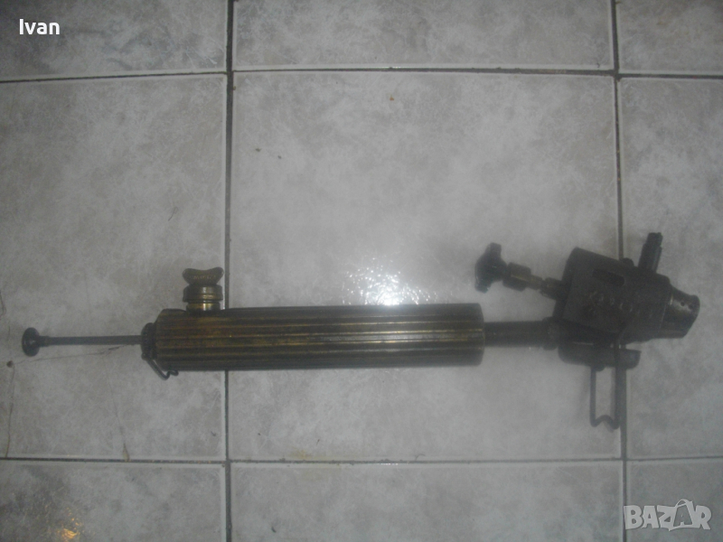 ОПИСАНИЕ на бензинова лампа горелка - цена 99 лв. Старо качество, българска НРБ на завод Хром - Силистра. Маркировки на завода върху капачката и от двете страни на главата. Запазен външен вид на горелката и добро работно техническо състояние. Без липси. Бронзов резервоар, бронзова капачка, бронзова оребрена с прорези предна глава - масивна от плътен бронз, възможност за поставяне на поялник бензинов отгоре на главата. Покритието над главата е метално с маркирани надписи на завода производител. Бакелитови врътки на ругулацията и на помпата отзад.Стойка метална масивна отпред за самостоятелен стоеж на горелката, кука стойка метална отзад за окачване на горелката. Дължина на лампата горелка 43 см със затворена помпа, при отворена 50 см. Помпата също изцяло е бронзова. Горелката е празна/без бензин. При проба и тест в офис Еконт трябва да си носите бензин за проба. Тегло на горелката лампа в празно състояние - 1,8 кг. Цена - 99 лв - твърда и крайна/без коментар.