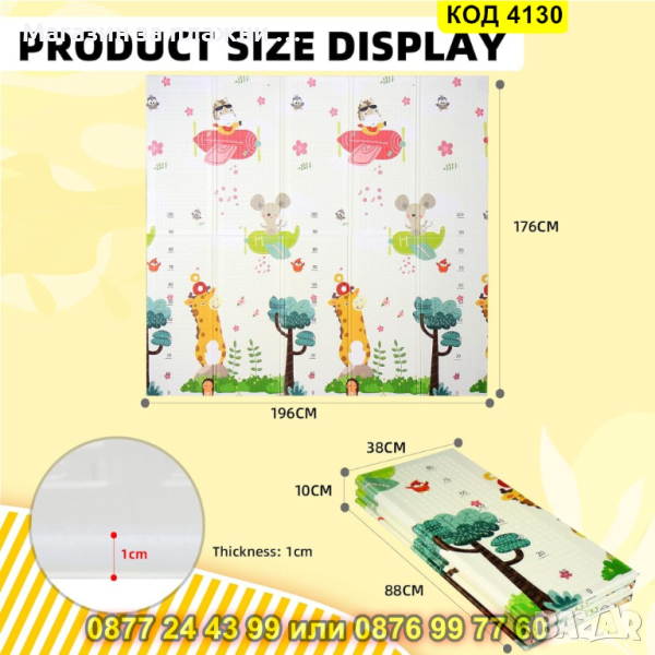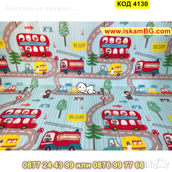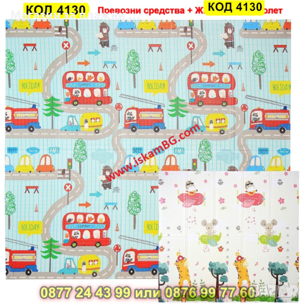 Сгъваемо детско килимче за игра, топлоизолиращо 180x200x1cm - Животни + Превозни Средства -КОД 4130