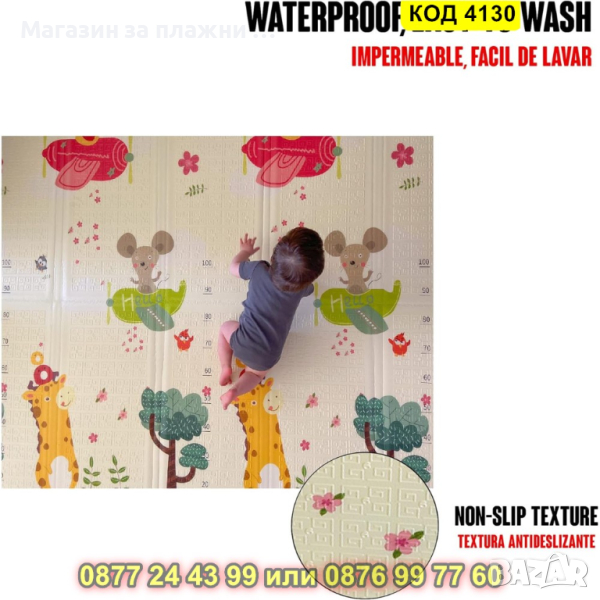 Релефната повърхност предпазва от подхлъзване и в същото време стимулира фината моторика на децата. Цветните принтове стимулират зрението и въображението.