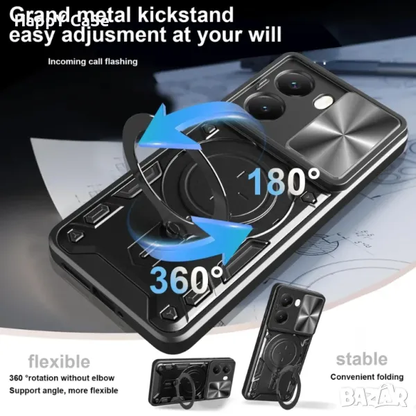 4. Голям метален пръстен отзад на гърба. Служи като стойка на която телефона може да се обляга в хоризонтално и вертикално положение. Също пръстена може да се използва и като finger holder за сигурно захващане на телефона с един пръст. За по-голямо удобство, пръстена може да се завърта на 360 градуса.