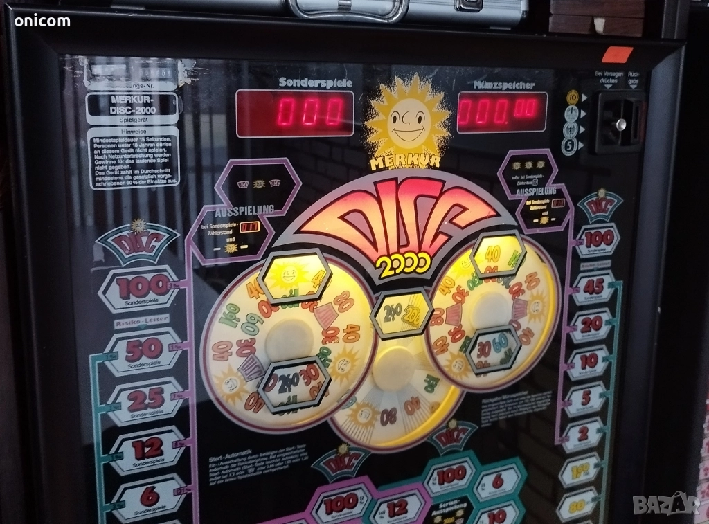 "Merkur DISK 2000"-една от най-играните немски ротативки от 80-те и 90-те.Работеща с бг жетони,налични ключове.
