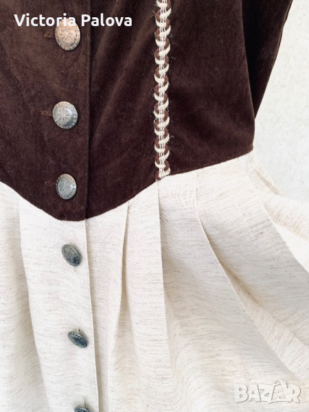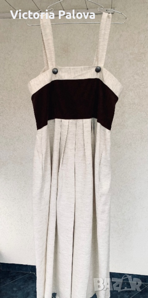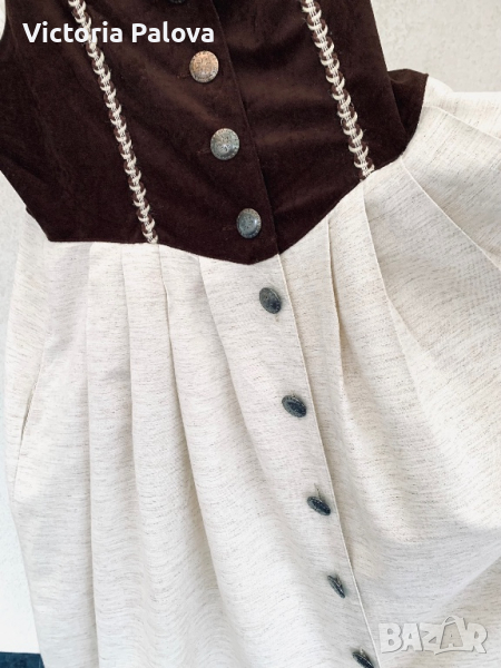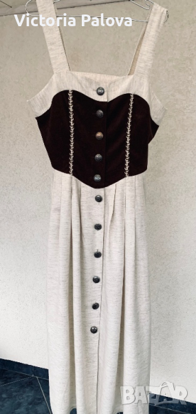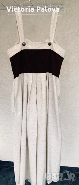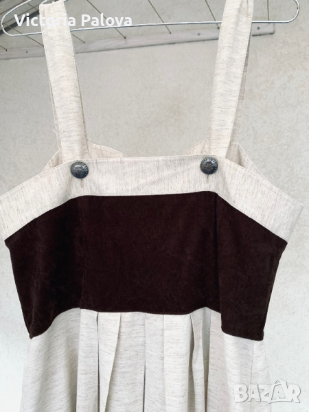 Роклята е необикновена, тежка вискоза и лен, горната част ( кафявата) е полиестер, прилича на кадифе, копчета до долу, широка удобна ( 4,7см) презрамка, два вътрешни джоба. ГО - 49см, талия - 44см, дължина от подмишница - 105см, презрамката е 19,5см.