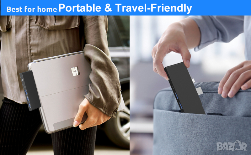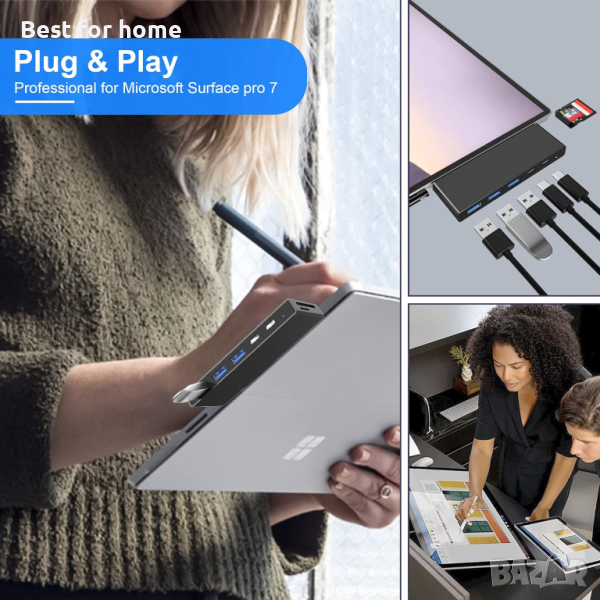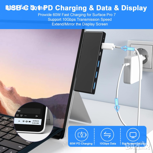【ЗА SURFACE PRO 7】: Докинг станцията 7-в-1 surface pro 7 превръща оригиналните 2 порта в 7 функционални порта: 3 USB3.0 порта, слотове за SD и Micro SD карти, USB-C 3.0 (за 5Gbps данни), USB -C 3.1 (за дисплей + 10Gbps данни + 60W зареждане).