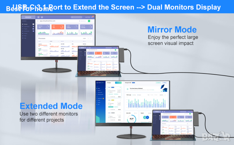 【РЕЖИМИ НА ДВОЕН ДИСПЛЕЙ】: Портът USB-C 3.1 може да дублира или разшири друг монитор, което осигурява повече място за вашата работа и можете да правите различни проекти на 2 монитора, идеална джаджа за видео редактори, фотографи и програмисти.