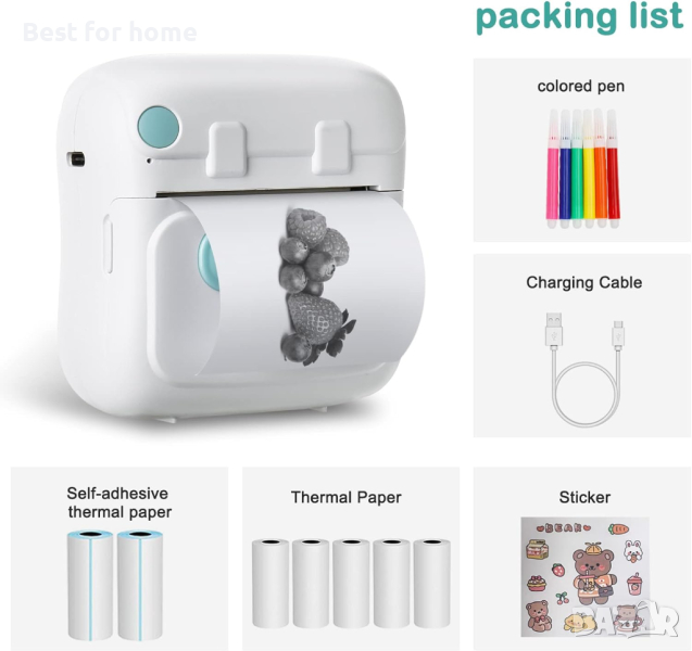 Многофункционален термопринтер (сканирайте QR кода, за да изтеглите приложението). Висококачествен фотопринтер за запис на най-добрите моменти. Нашият преносим принтер поддържа различни функции, може не само да отпечатва директно снимки и етикети, но и да отпечатва напомняния, диаграми, списъци, записи, QR код и т.н.