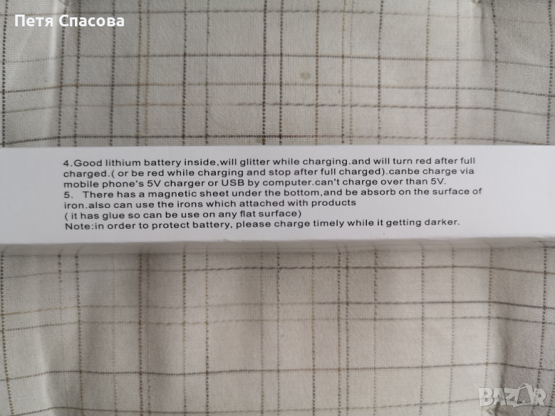 800mah литиево-йонна батерия, която може да се презарежда с помощта на включения Micro USB кабел. Продължителността на светене на батерията е до 60 дни в режим на сензор за движение и максимум 2 часа в непрекъснат активен режим.