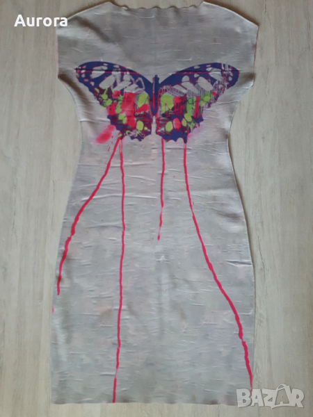 Къса двулицева рокля неопрен на Animapop, ефектни цветове, произв.в Италия, S. Дълж.92 см, талия 33 см, ханш 42 см. Няма нужда от гладене, много практична. Отлично запазена.