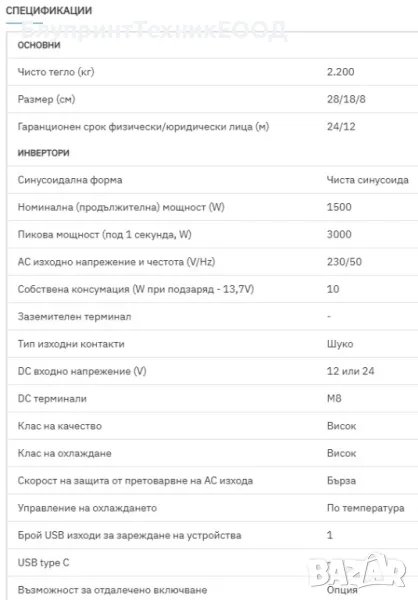*Пикова мощност: 3000W - налична е за част от секундата! Тя е необходима за стартиране ня някои консуматори при които необходимата мощност за „развъртане“ на електромотора е в пъти по-голяма от нужната след това. За пример хладилник за домашна употреба в повечето случаи изисква стартова (пикова) мощност от около 900 вата а секунда след това продължава да консумира едва 50-90 вата. Такива електроуреди са компресорните хладилници, класическите фризери и климатици които нямат плавен старт, винтовите подемни крикове и т.н.