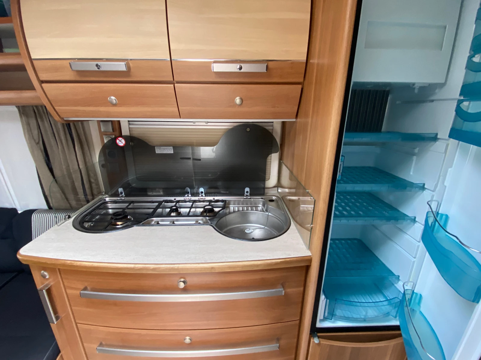 Караваната е с две единични легла и голямо сепаре , ставащо на спалня. Оборудвана е с кухня с газови котлони, голям хладилник, печка за отопление, тоалетна, LED осветление, амбиентна светлина и всичко необходимо за ползване. За съжаление е минала през бордюр и има щета. Повредени са двата шенкела и двете джанти. Моста е свален но не е ремонтиран. Караваната е оборудвана и с автоматична хидравлична система за нивелиране, мувър за самостоятелно движение и др.