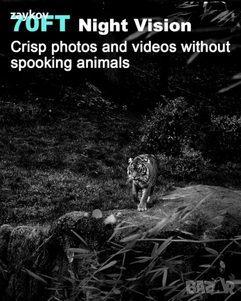 Супер нощно виждане и слабо светещи инфрачервени светодиоди: Камерата за пътеки е оборудвана с мощни 22 слабо светещи инфрачервени светодиода, разполага с подобрена 850nm инфрачервена технология, прави тази камера за игра по-невидима, която може да показва поведението на животните, без да ги безпокои, включва технология за адаптивно осветление за предотвратяване на преекспониране или прекомерно затъмняване, която може да осигури ясни нощни изображения и видеоклипове в пълна тъмнина, предлага ярко нощно виждане до 70 фута.