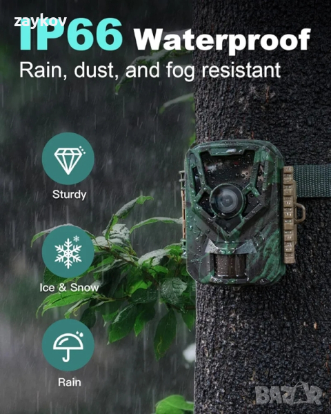 IP66 Водоустойчив: JDL201 е проектиран да издържа на екстремни среди, благодарение на здраво интегрирания дизайн на корпуса на камерата и висококачествения гумен пръстен, гарантиращ нормална работа от -22°F до 158°F, отлично качество може да се използва в пустини, тропически гори и др. Ефективният PIR дизайн работи за намаляване на фалшивите задействания, с впечатляващ живот на батерията от 17 000 изображения. По-малкият размер ги прави по-лесни за скриване от кражба/вандализъм, а също и много по-лесни за пренасяне на полето.