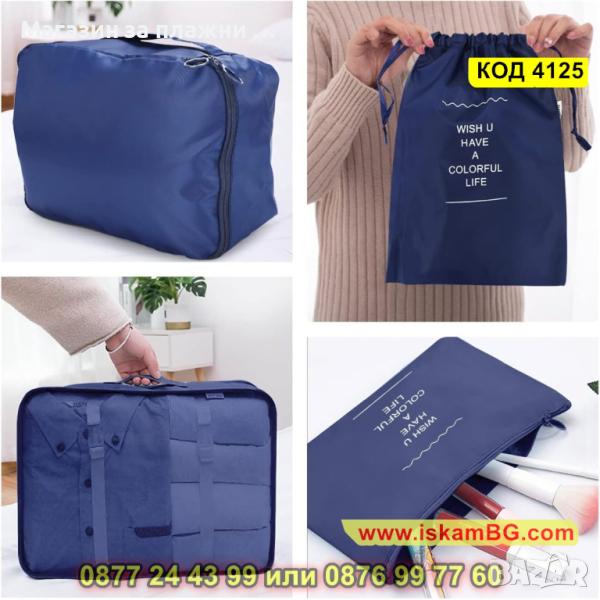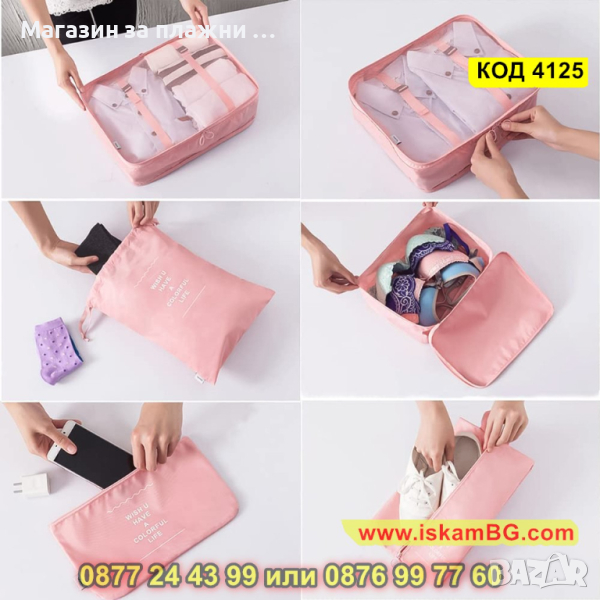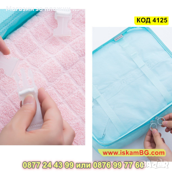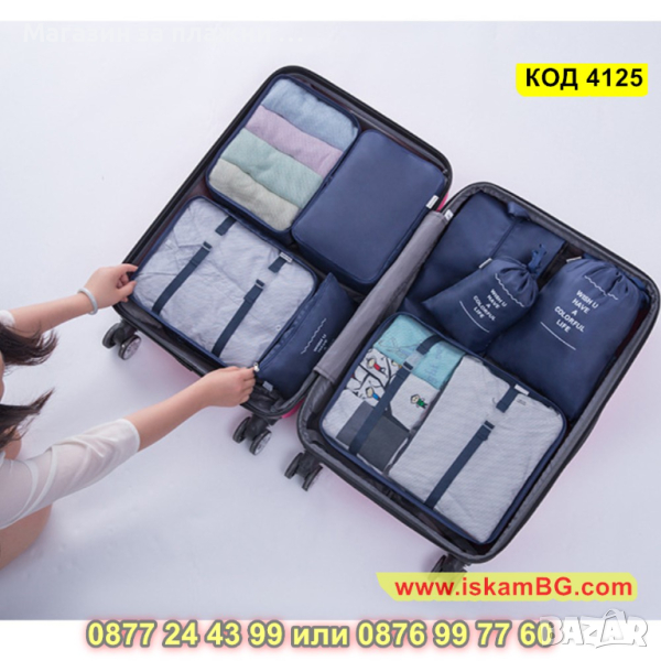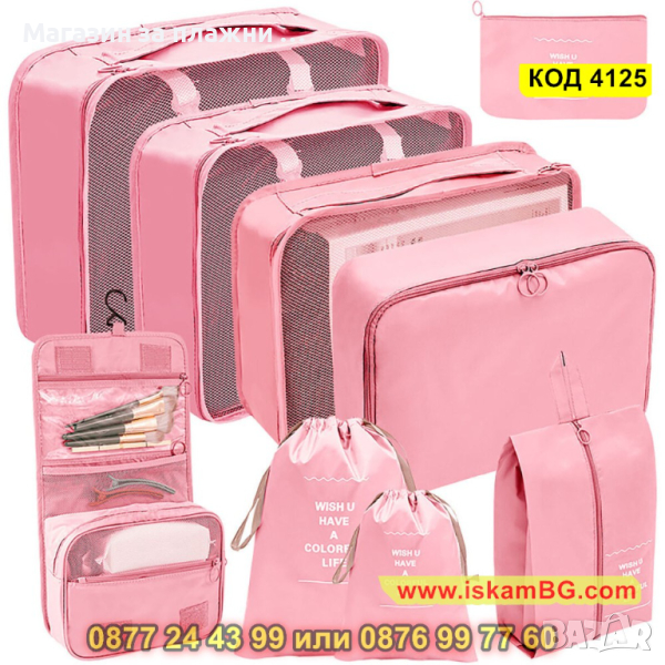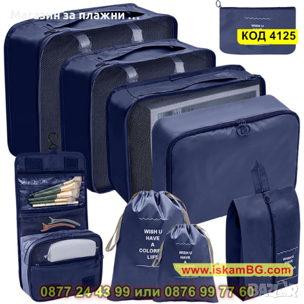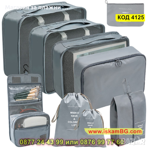 Комплектът, който Ви представяме включва 9 на брой органайзери за багаж в куфар. Те имат различни форми и размери и са идеалния аксесоар, който ще Ви бъде необходим за едно пътуване! Подредете и организирайте перфектно всичко онова, което Ви е необходимо, благодарение на нашият комплект от 9 части органайзер за пътуване. Комплектът от органайзери са направени с изключително внимание към детайлите. Съставени от издръжливи материали, които ще предпазят вещите Ви наранявания и замърсявания докато сте на път. Комплектът органайзери е подходящ за съхранение на дрехи, обувки, аксесоари или лични предмети.