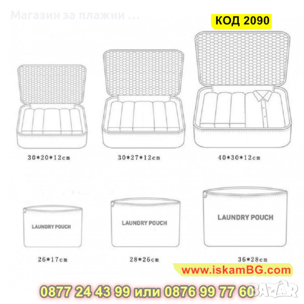Комплектът от 6 части органайзери, предназначен за съхранение на различни предмети и аксесоари по време на пътуване. Комплектът включва 3 различни по големина чанти и 3 несесера, които се закопчават със цип и имат прозрачни капаци. Позволяват да съхраните документи, кабели, дрехи, козметика и всичко, от което имате нужда. Органайзерите са направени от материал с високо качество, лесни са за почистване и кутиите притежават прозрачни мрежести капаци.