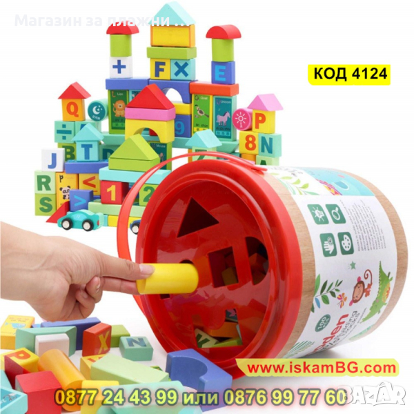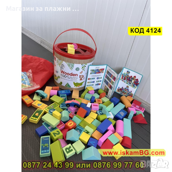 Комплект от 50 части цветни дървени блокчета конструктор с кофа за съхранение - КОД 4124