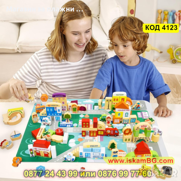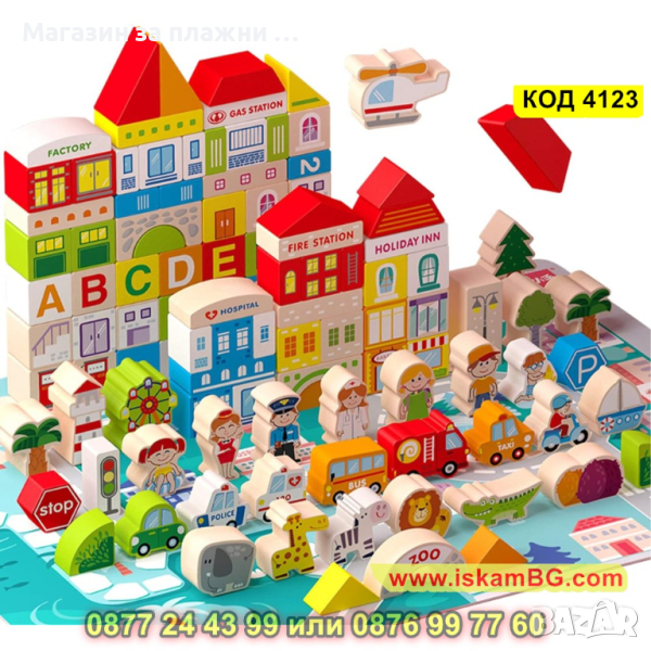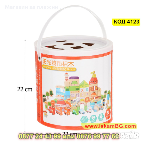 Дървен конструктор от 120 части цветни дървени блокчета - Слънчев град - КОД 4123