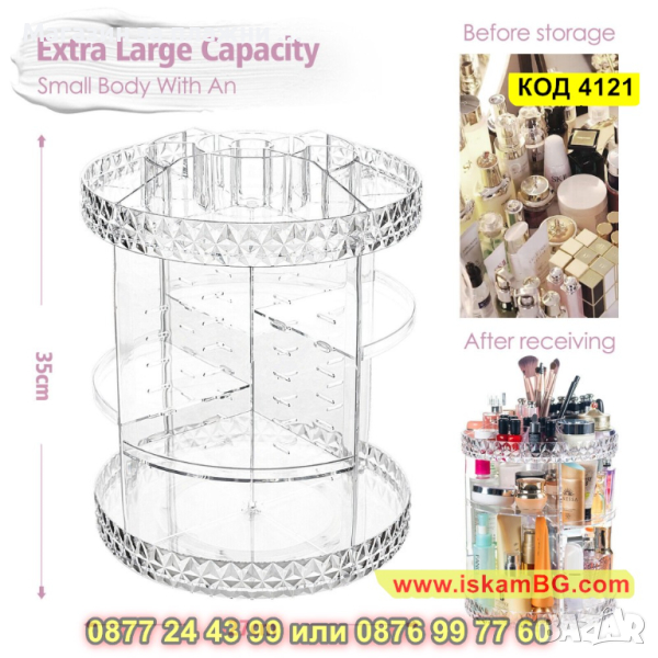 Създайте си стил и удобство с този красив органайзер за козметика, който се завърта на 360 градуса и е прозрачен. Перфектният уред за съхранение на любимата Ви козметика! Подходящ е да подредите Вашите парфюми, кремове, грим и всичко необходимо от ежедневието! Всяка част от този органайзер е създадена с внимание към детайла, за да се съчетава отлично с Вашата гримьорна или тоалетна маса в спалнята или банята Ви, предпазвайки любимите Ви аксесоари от прах или влага. Прозрачният органайзер за козметика е направен от висококачествен акрил и е с размери: 35 х 27 см.