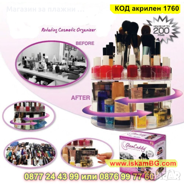 С този органайзер ще си спестите дълго време в търсене и нервите, от това, че няма да имате достатъчно време да се гримирате и направите още по-красива. Без повече ровене по различни шкафове и чекмеджета в търсене на конкретен цвят гланц на едно място, пудра на друго и т.н. Всичко може да се събере на този удобен органайзер Glam Caddy и да ви е винаги под ръка, когато ви потрябва. Със своята уникална форма тип торта и въртящ механизъм, можете да наредите всички свои гримове.