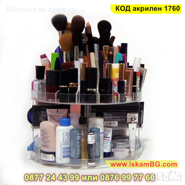 Стелажът събира около 200 предмета и е достатъчен, за да може всичко да е подредено, видимо и лесно за достигане. Просто завъртате и оглеждате всичко, избирате си и след употреба поставяте отново на мястото му. Няма да го има неприятно натрупване върху шкафчета и купчини върху тоалетката. От четката за зъби и почистващите лицето продукти до сенките и гланца завършващи стайлинга Ви. Организирайте себе си и времето си, събирайки всичко, което ви е необходимо на едно място за бързина, комфорт и подреденост.