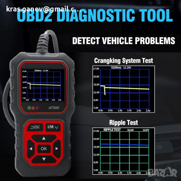 【Нови функции Надградени】За разлика от друг инструмент за диагностика на OBD2 четец на кодове, ние актуализирахме този AT500 с новите функции, добавихме функцията волтметър и индикатор за нивото на батерията и тест на системата за завъртане, анализиране на състоянието на системата за завиване, показване на напрежението за завъртане и времето за завъртане, Графика на формата на вълната на теста на системата за задвижване и зареждане, Анализиране на състоянието на системата за зареждане, Показване на пулсациите, напрежението на разтоварване и натоварване, Начертаване на графика на вълната на теста за пулсации