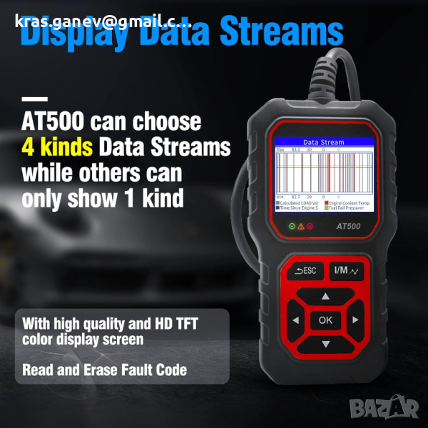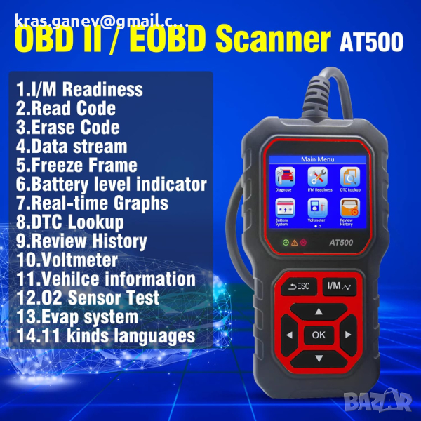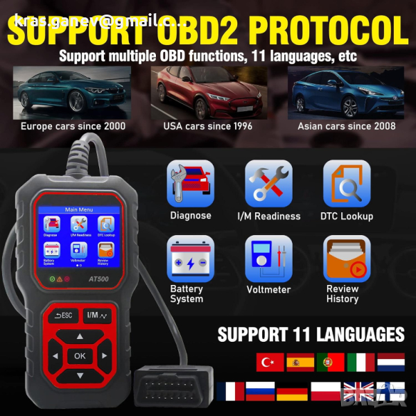 【Мащабно приложение】Скенерът AT500 OBD2 поддържа 9+ протокола, съвместими с всички автомобили от 1996 г. насам OBD II &CAN съвместим със САЩ, Европа и Азия, 11 езика, вградени в системата (EN, FR, IT, ES, DE, PT, NL,PO ...)&Ръководството за потребителя на 8 езика, много удобно за клиентите; Лесно определя причината за лампата за проверка на двигателя (MIL), извлича общи (P0, P2, P3 и U0) и специфични за производителя (P1, P3 и U1) кодове, показва DTC дефиниции на екрана на устройството, чете PCM поток от данни на живо