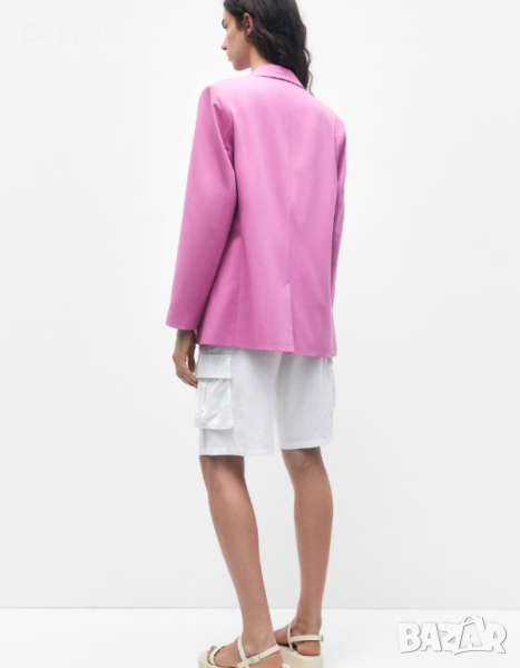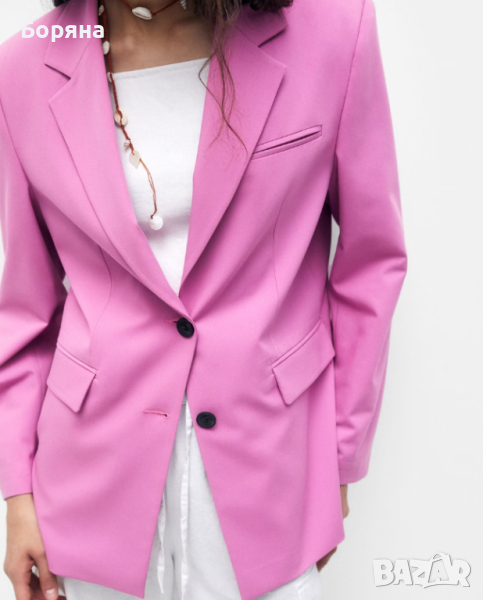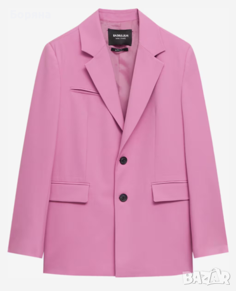 Нов с етикет наситено розов блейзър на Pull & Bear, спортно елегантен, леко оувърсайз, с черни матови копчета, ревер и джобове.