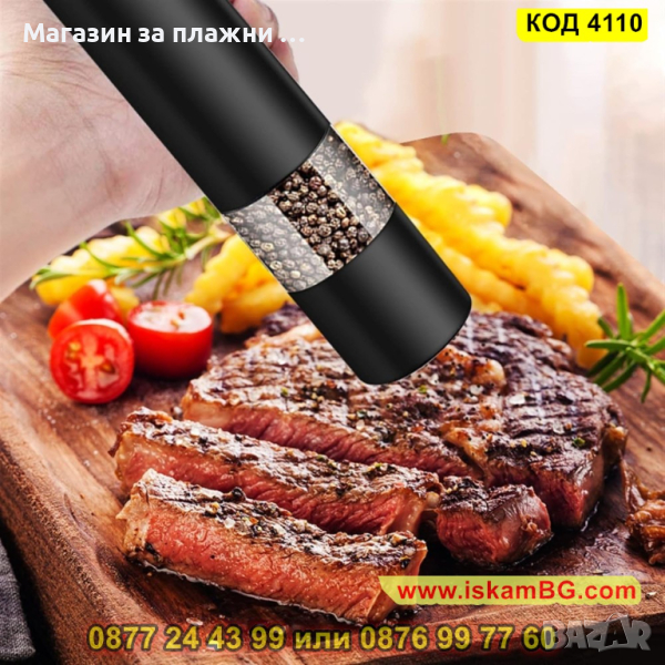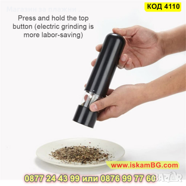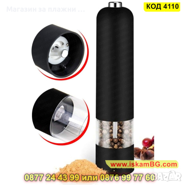 Електрическата мелница, която Ви представяме е голяма и предназначена за лесно и бързо смиляне на черен пипер, сол и други видове подправки. С помощта на само един бутон Вие ще обработите желаната подправка от Вас! Забравете за досадното и изморително ръчно мелене с нашата електрическа мелничка за подправки.