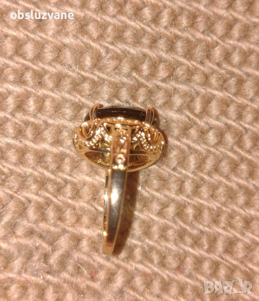 Внушителен моден пръстен с интересни орнаменти в покритие от жълто злато и инкрустиран голям кафяво-лилав скъпоценен камък опушен кварц.